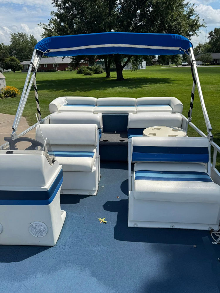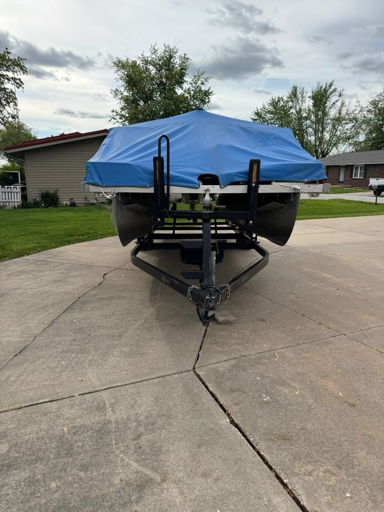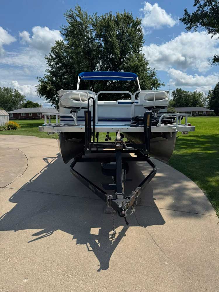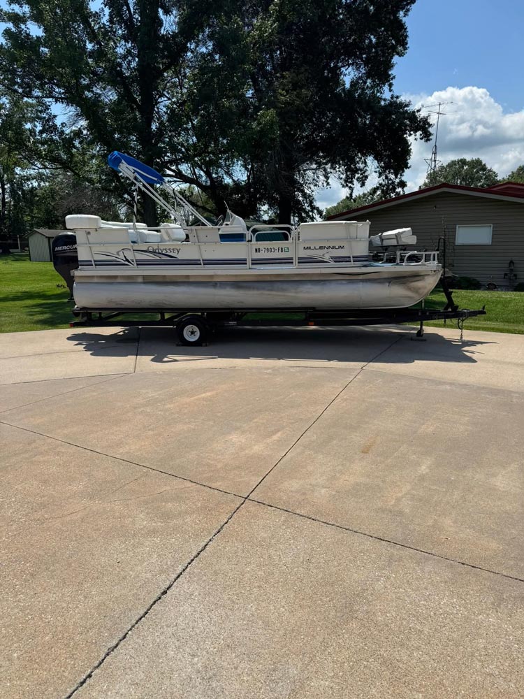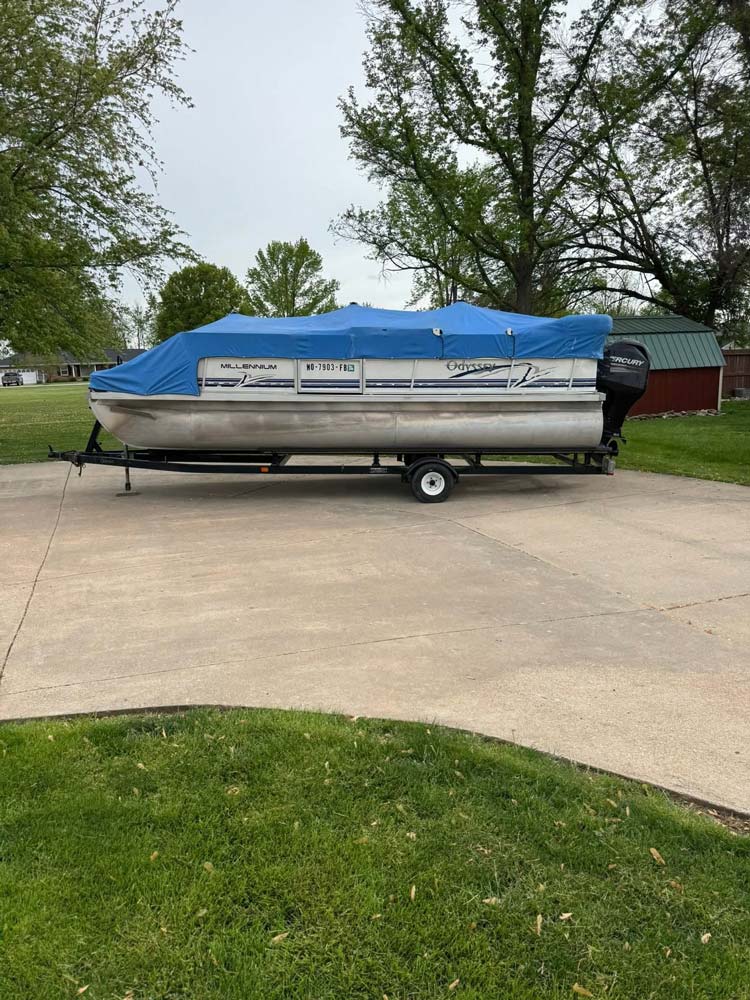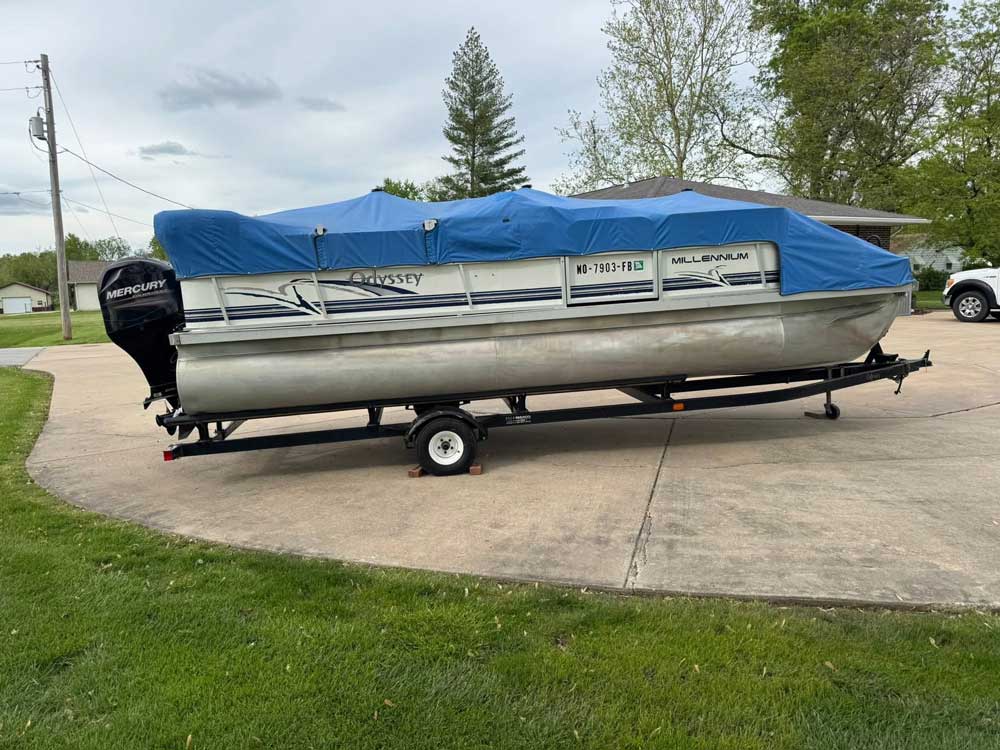 2001 21′ Odyssey pontoon with a 2013 90hp Mercury 4 stroke and 2001 Shorelander single axle trailer
